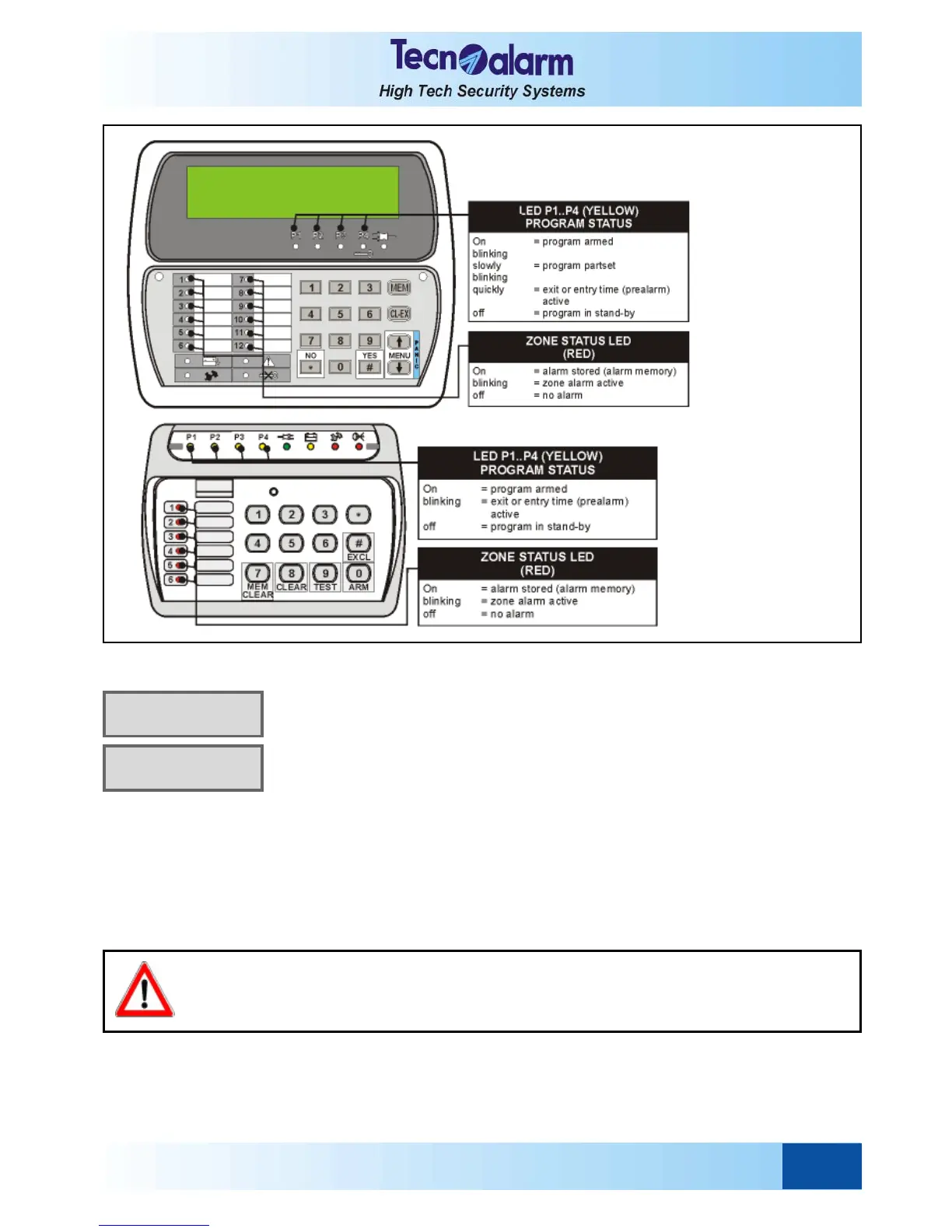 On expiry of the exit time, the program leds become lit and remain lit until disarming of