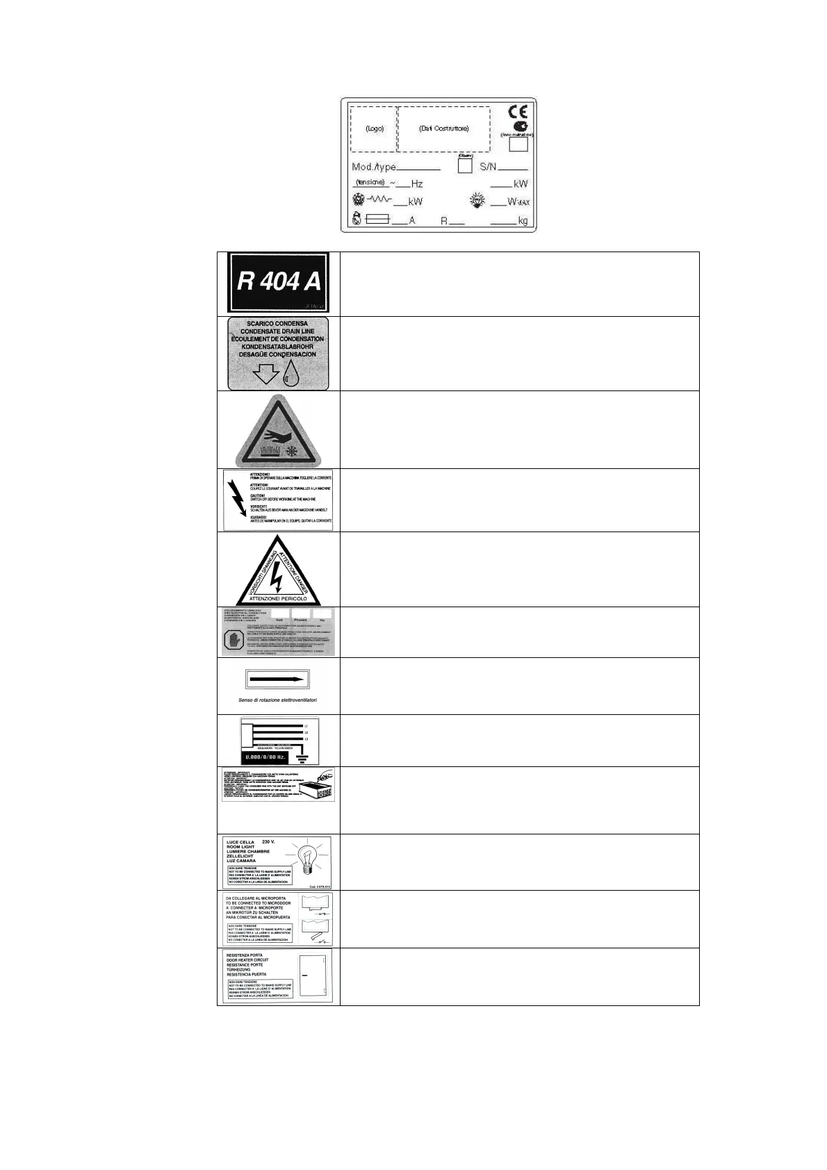Technoblock CS - Warning and Attention Plates; Electrical and Operational Safety Plates; Unit Connections and Indicators; Component Cables and Maintenance Alerts