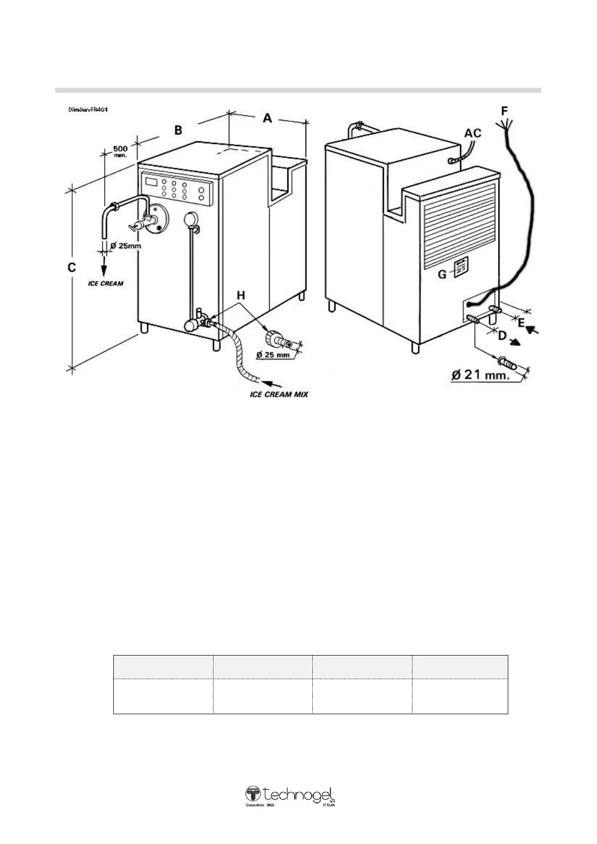 - Connect the machine to the electricity supply at point F with a cable coming from above to avoid
