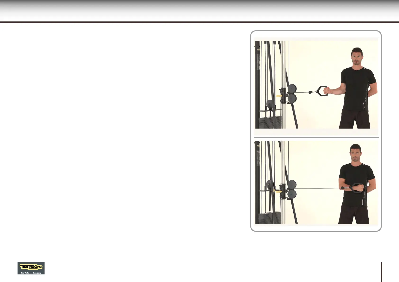 Stand with the side to be exercised toward the weight stack, elbow at your side, arm bent at 90°
