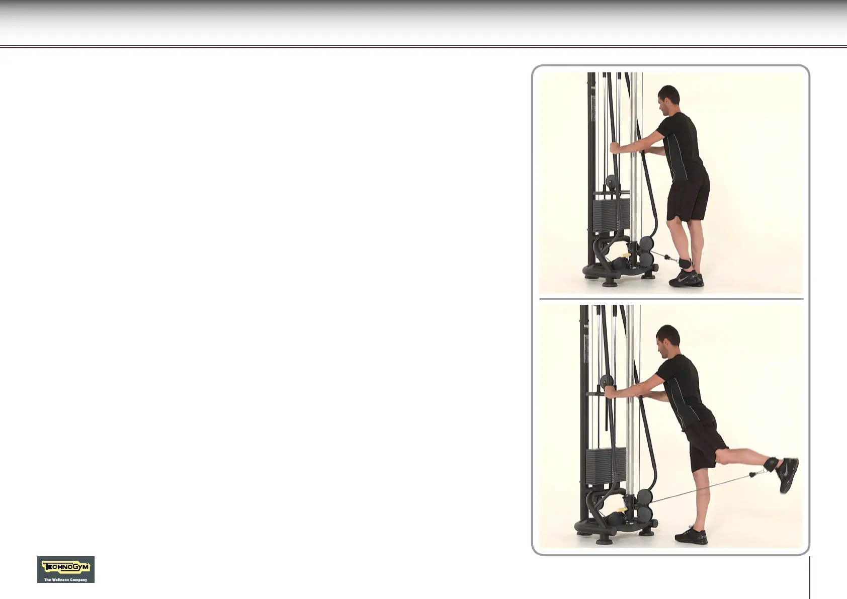 Stand facing the weight stack and grasp the two side handgrips to steady your torso. The leg to