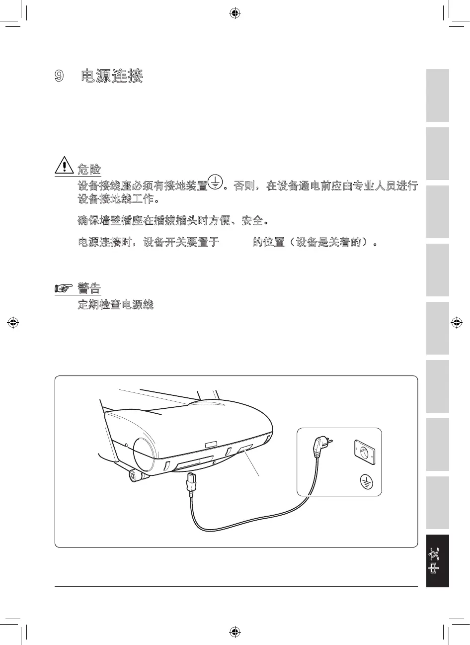 电源连接时,设备开关要置于OFF(0)的位置(设备是关着的)。