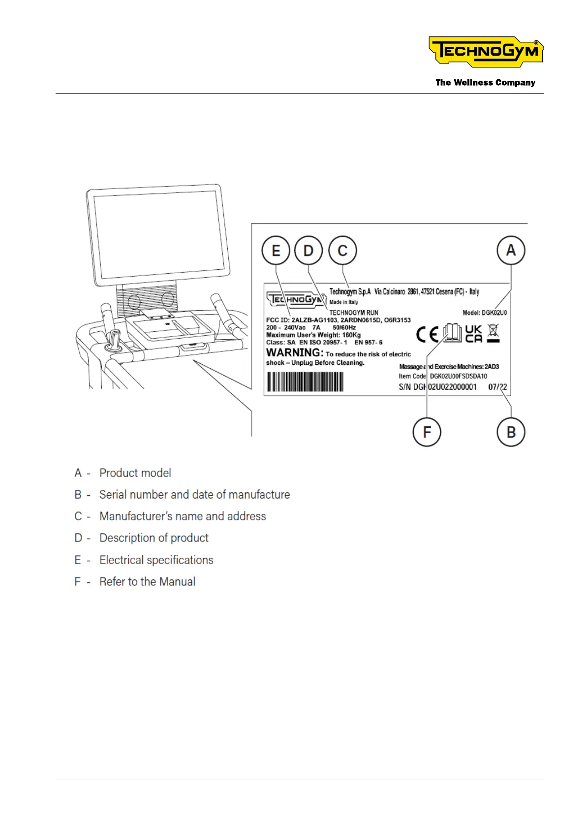 Technogym DGK02U0 - Position of Serial Number and Equipment Code
