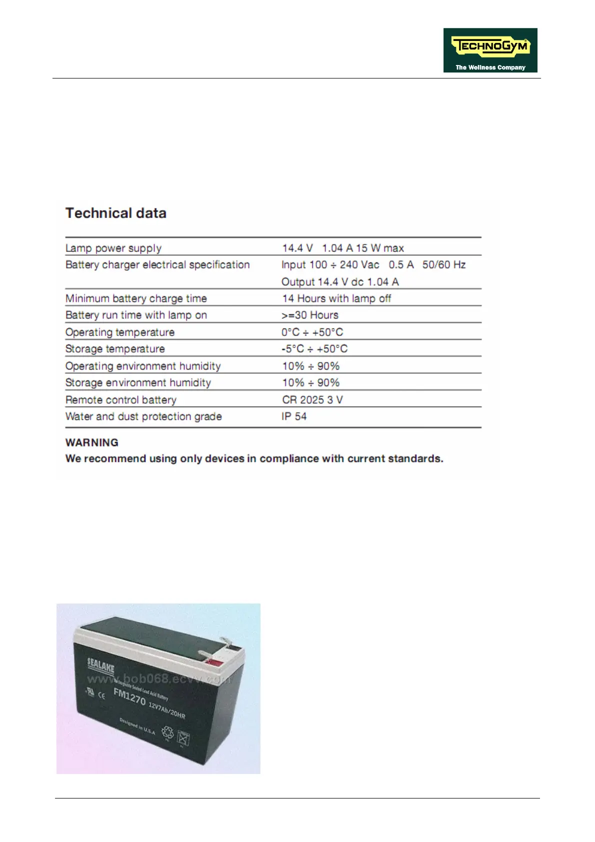 Technogym Easy Lamp - Technical Specifications; Easy Lamp; Battery