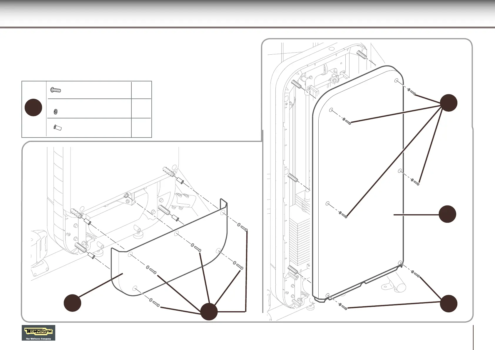 Assemble the protection panels for the weight stack (L) with the 6 screws (M).