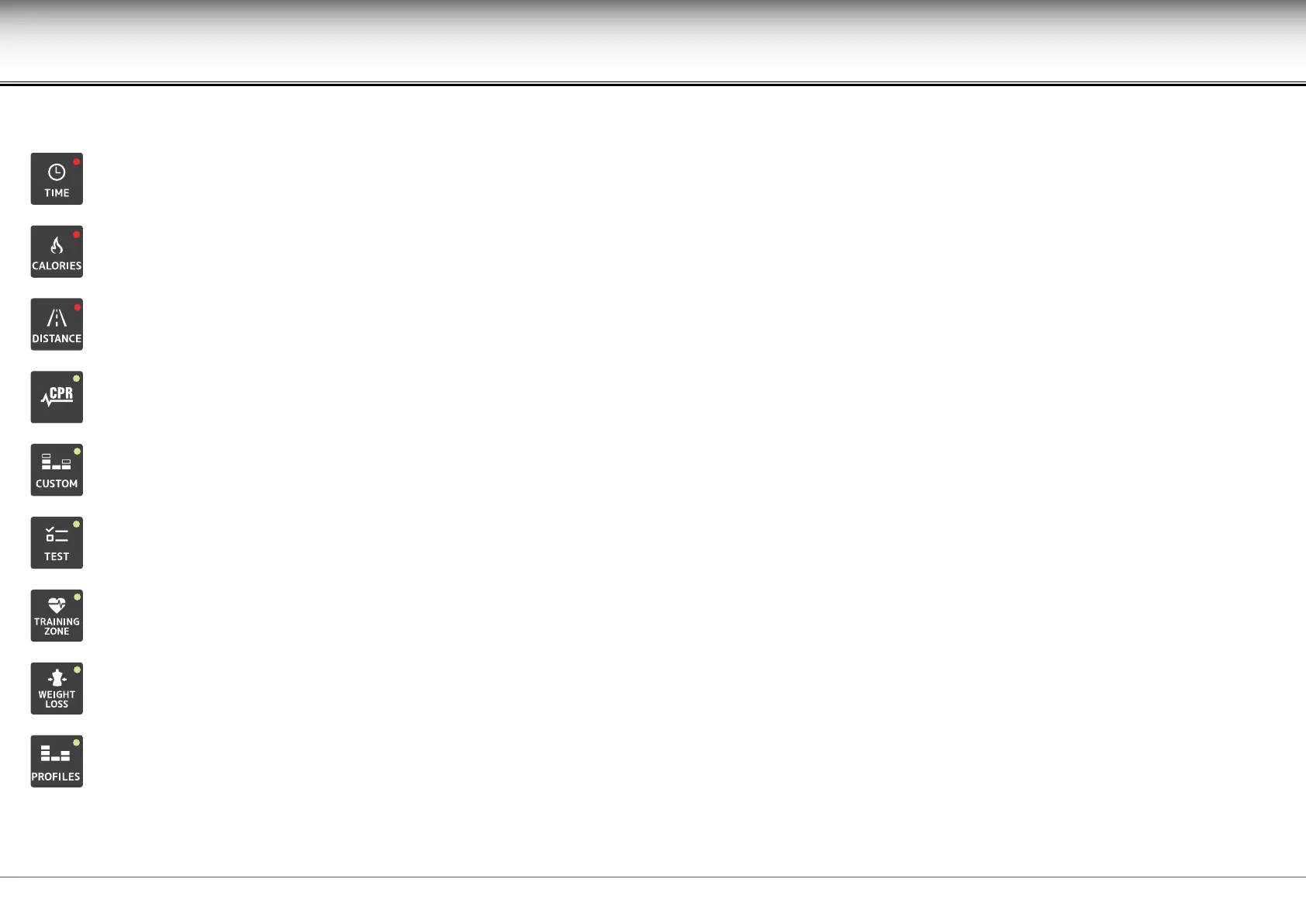 dened by one of the GOALS: time, distance or calories for predened proles; time or distance for personal proles.