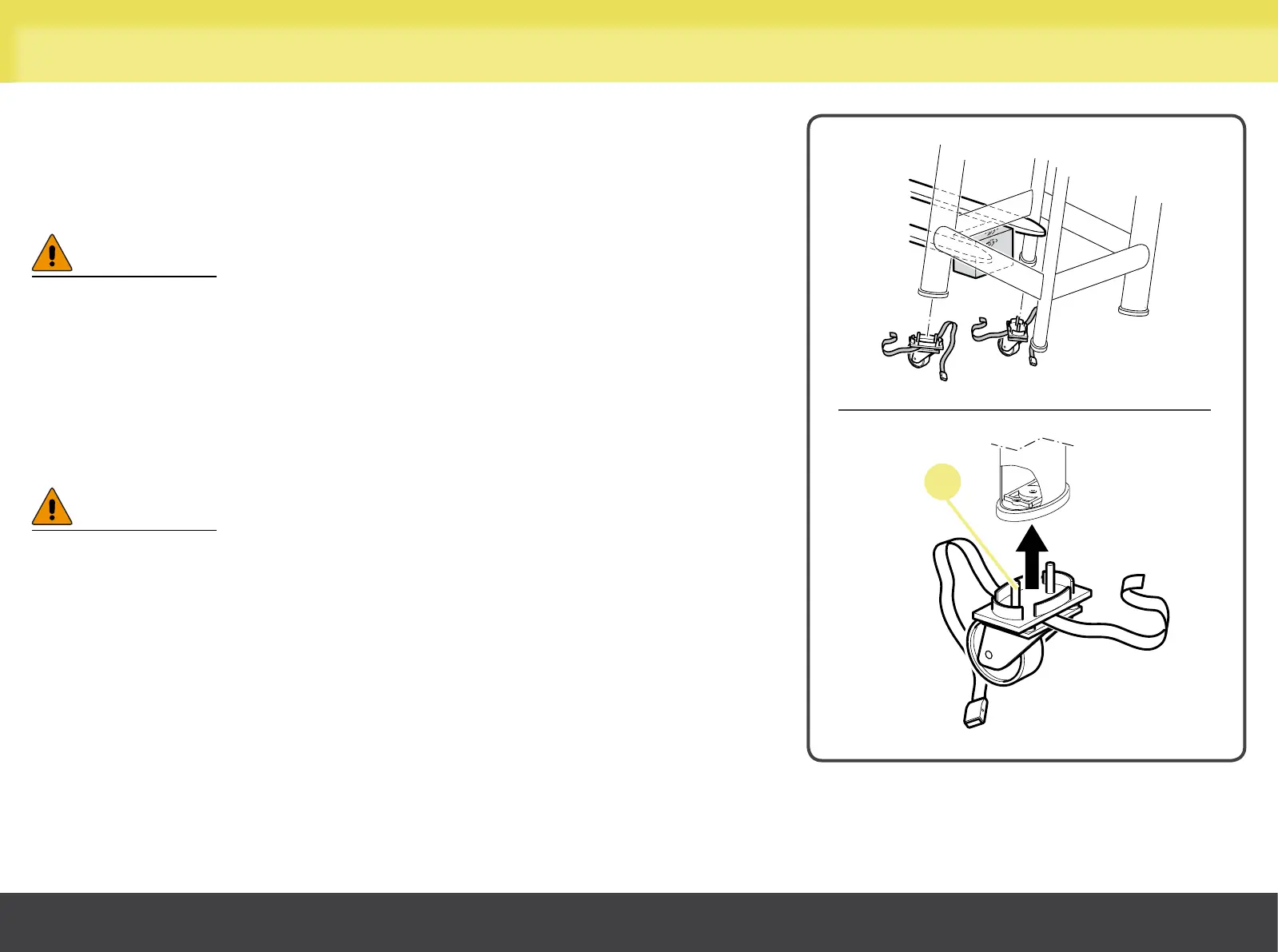 Fit two of the wheels: fit the castor stems (A) into the holes provided under the