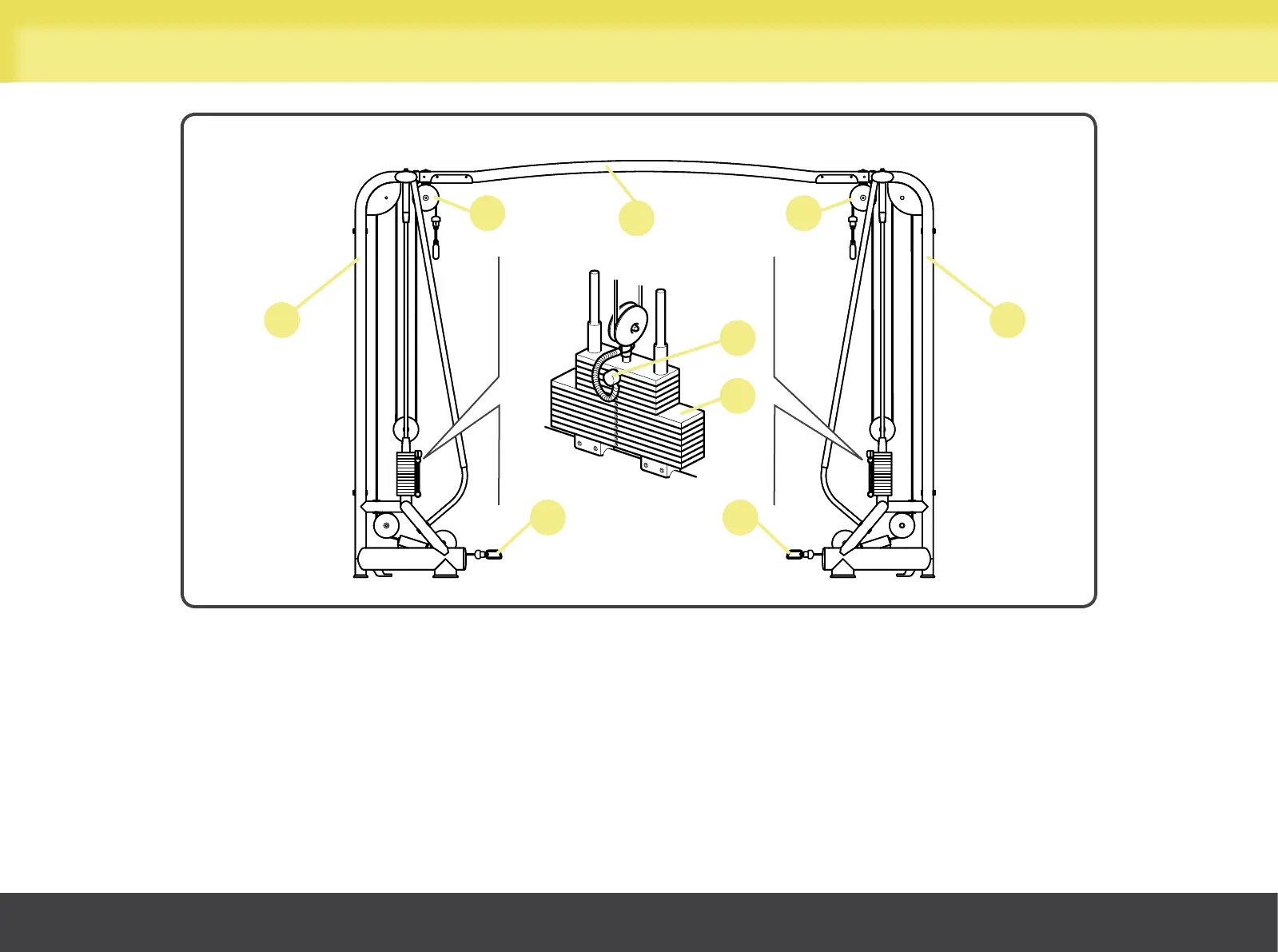 B Weight stack: each pulley, i.e. high (C) or low (D), operated by the user, moves the weights along two guides by means of a cable.