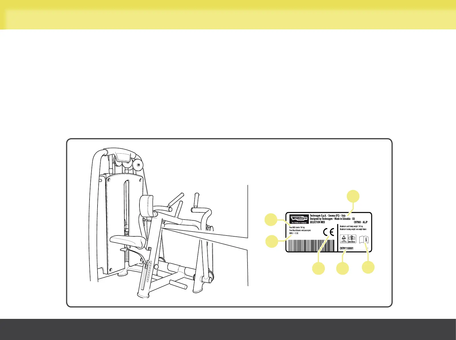 The equipment and manufacturer identification plate, placed on the frame on the side opposite the padded rest, gives the following
