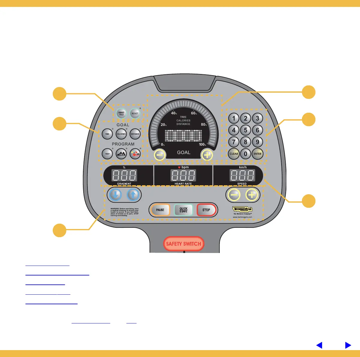 F - SMART FOLD key for folding up the treadmill and RESET key to reset the stand by after unfolding the