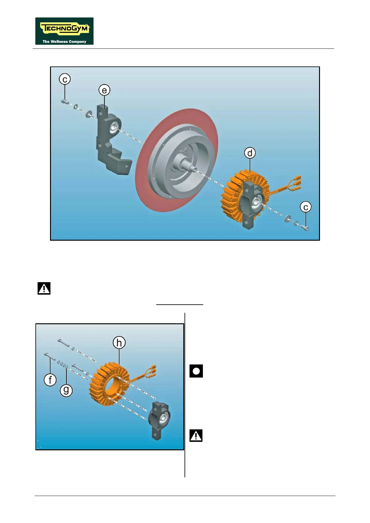 2. Remove the stator group (d) and the belt tension system support (e) on the opposite side.