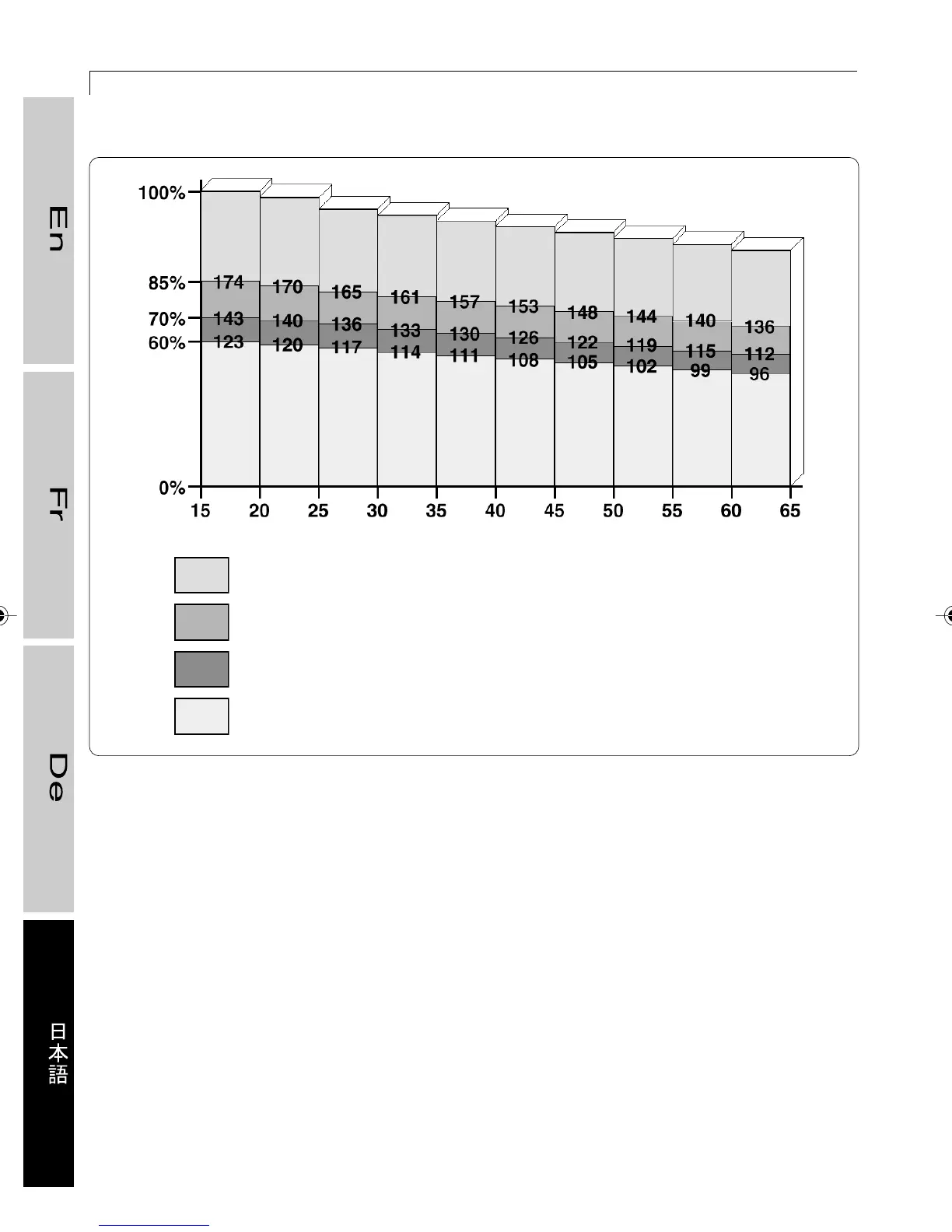 グラフを 見るには、横軸から ご 自分の年齢を探し、そこから上にたどると 60%、70%、85%に相