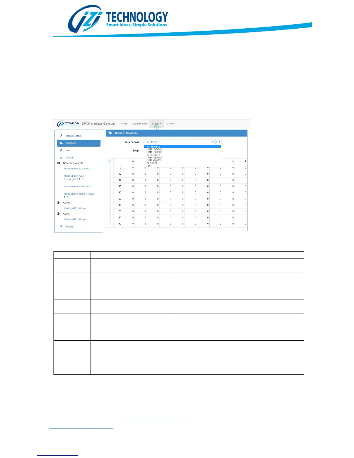 database as an array of values with a user selectable Data Format and Byte Swapping. Table 1 shows