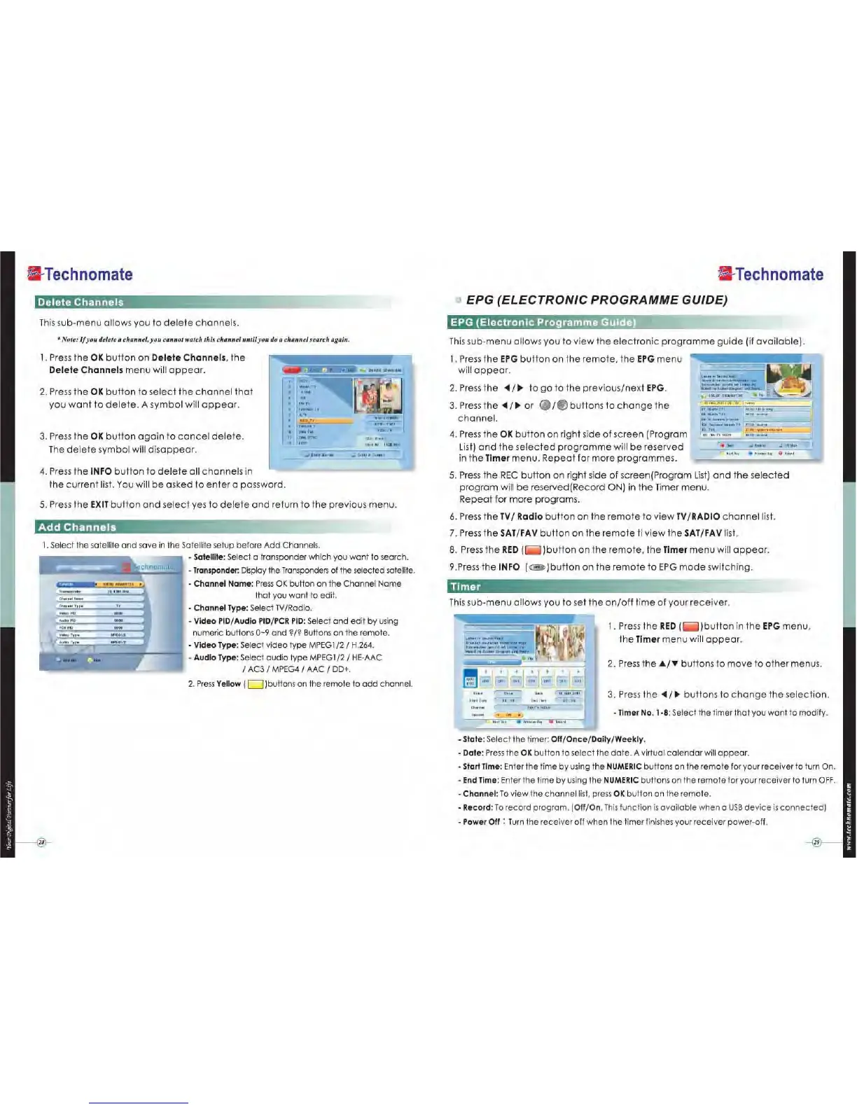 Technomate TM-5402 HD - Delete Channels; Add Channels; EPG (Electronic Programme Guide); Timer
