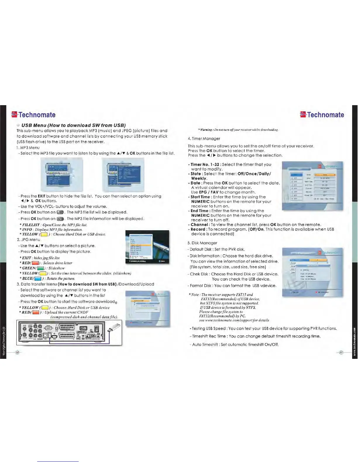 Technomate TM-5402 HD - USB Menu (How to download SW from USB); MP3 Menu; JPG Menu; Data transfer Menu (How to download SW from USB);Download;Upload