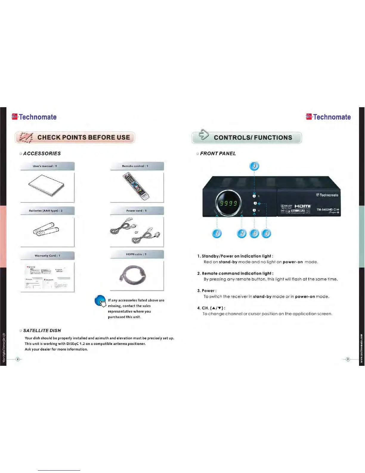 Technomate TM-5402 HD - CHECK POINTS BEFORE USE; ACCESSORIES; SATELLITE DISH; CONTROLS;FUNCTIONS