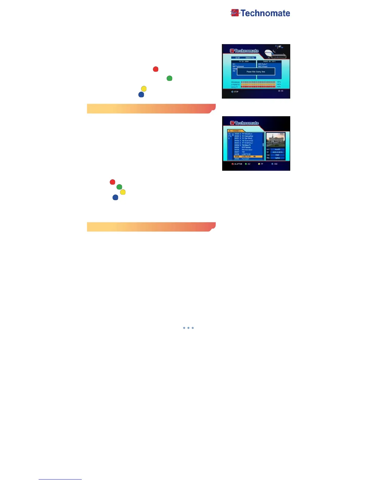 - RED ( ): Displays all channels/FTA channels/Scramble channels in current satellite.