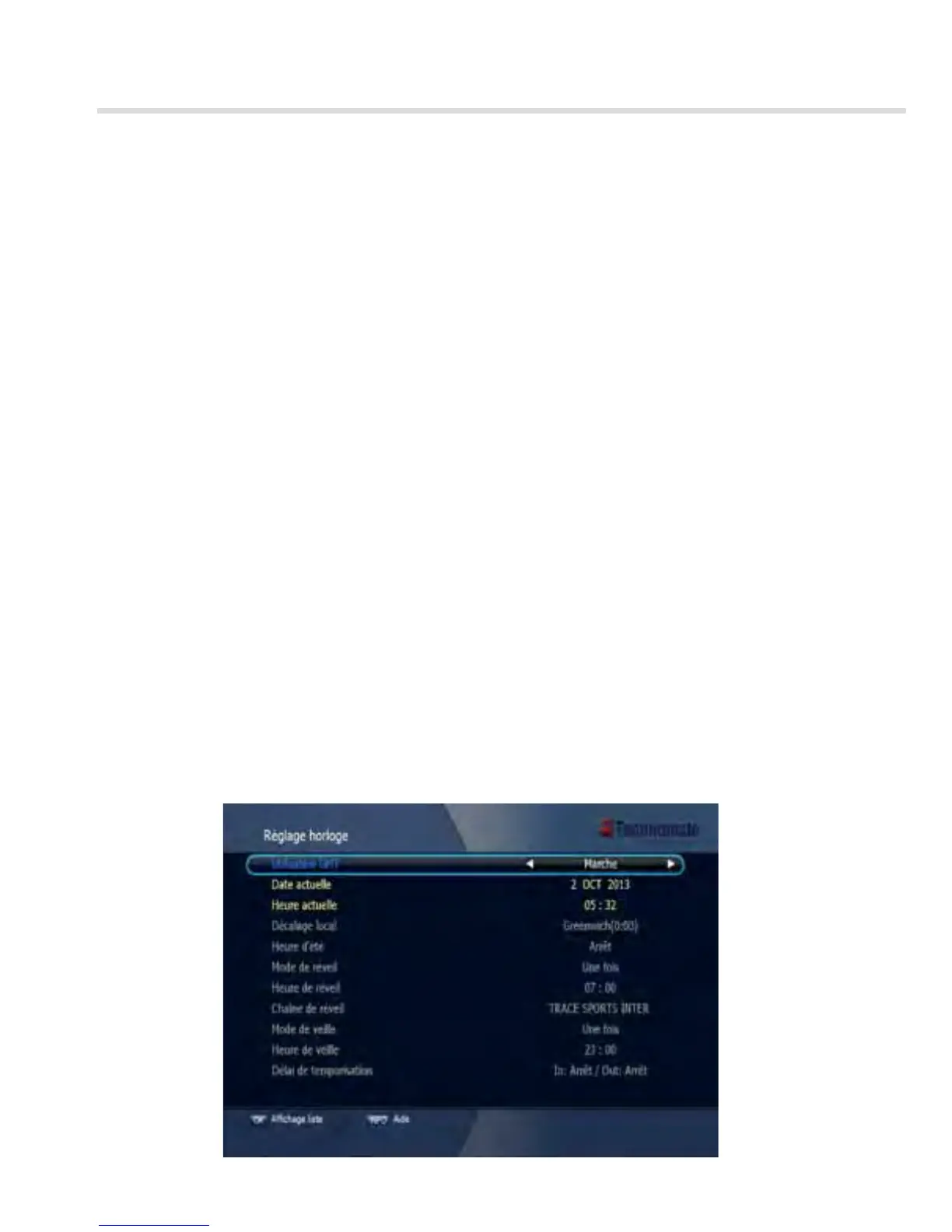 Ce sous-menu vous permet de spécifier l’heure locale, l’heure du réveil matin, la chaîne du réveil