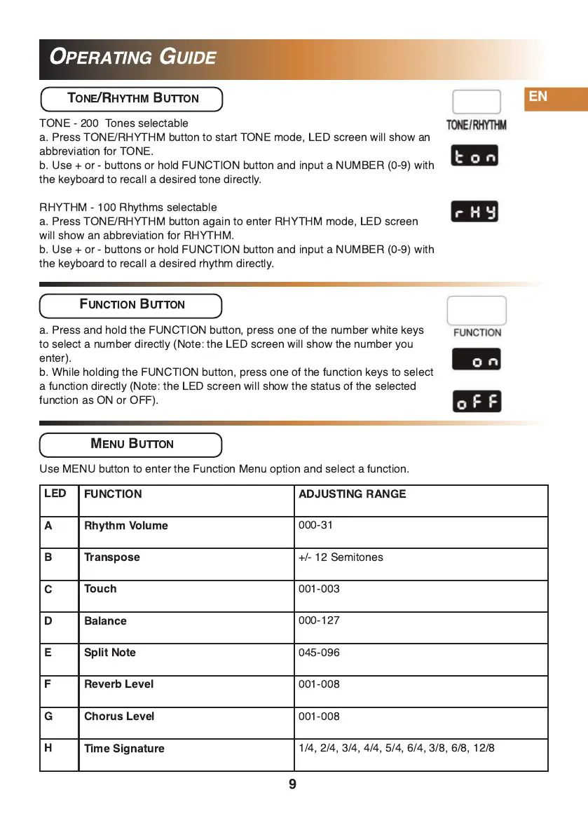 a. Press TONE/RHYTHM button to start TONE mode, LED screen will show an