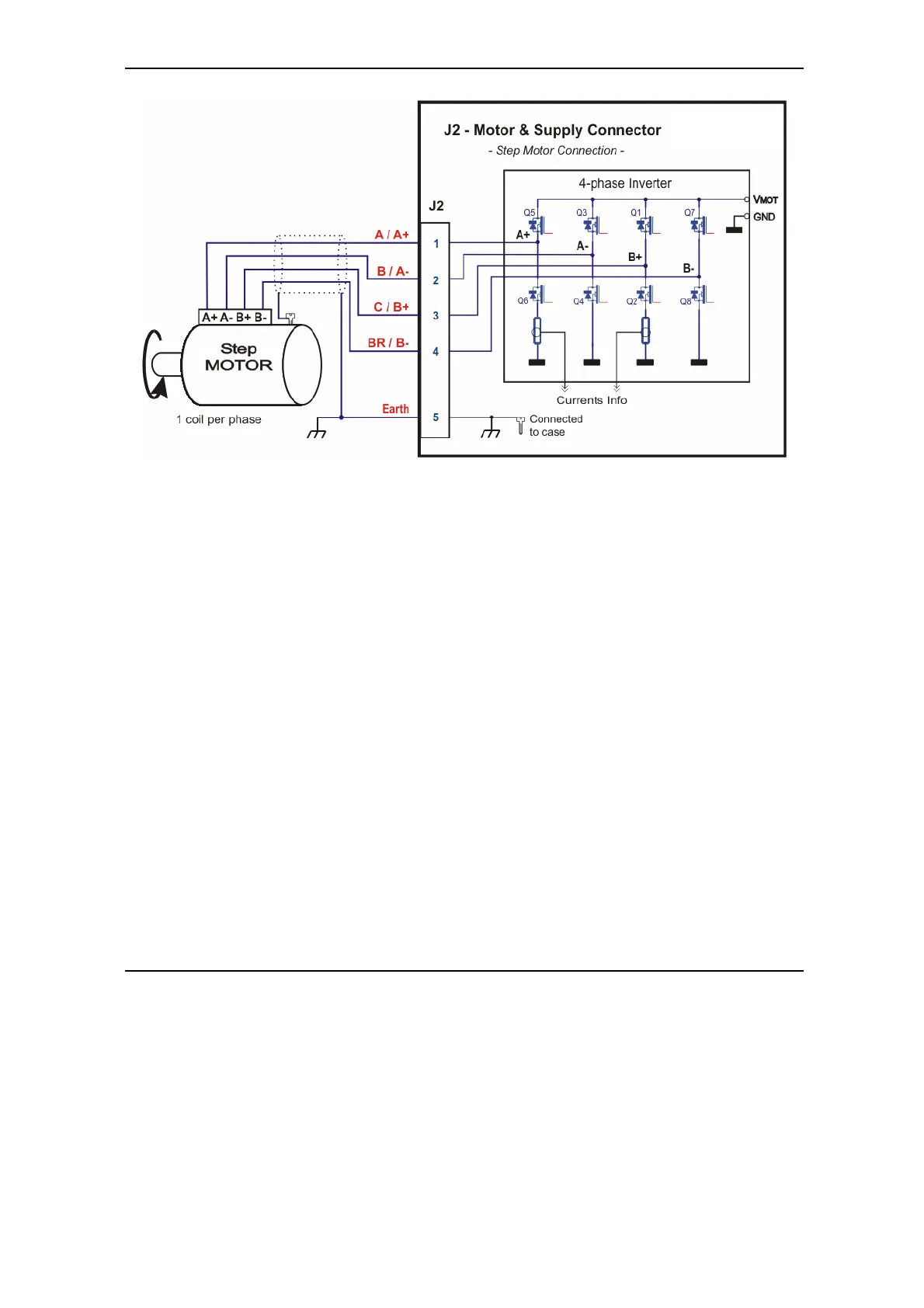 Figure 3.10. J2 – Step motor connection – 2-phase motor with 1 coil per phase