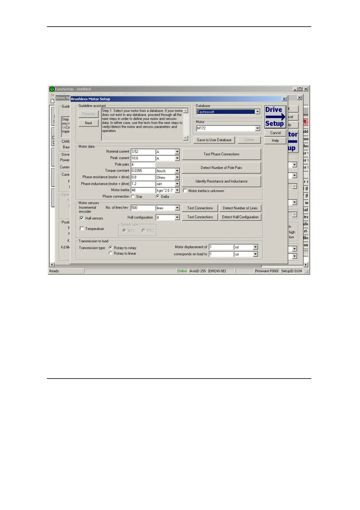The selection opens 2 setup dialogues: for Motor Setup and for Drive setup through which you