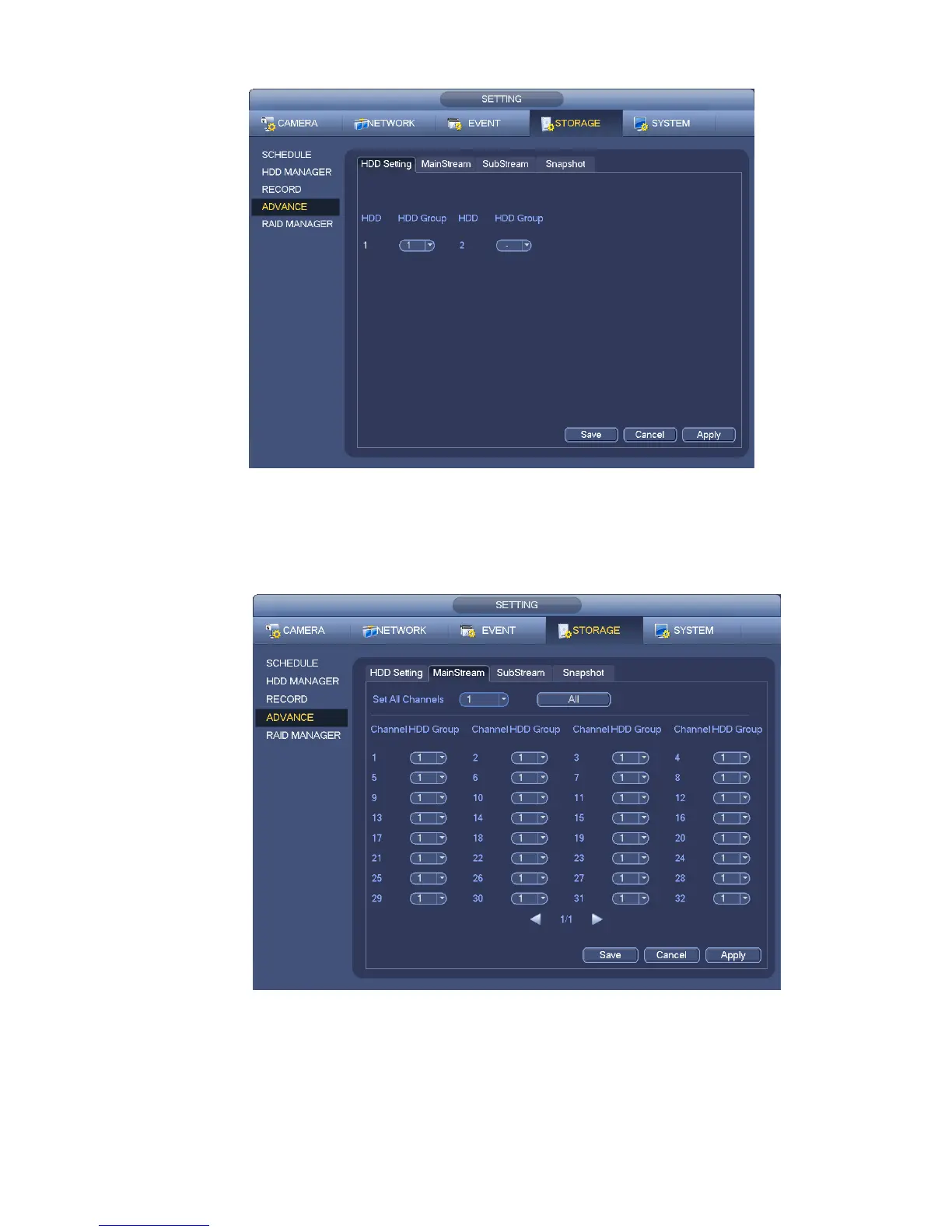 Click main stream/sub stream/snapshot button to set corresponding HDD group information. See Figure