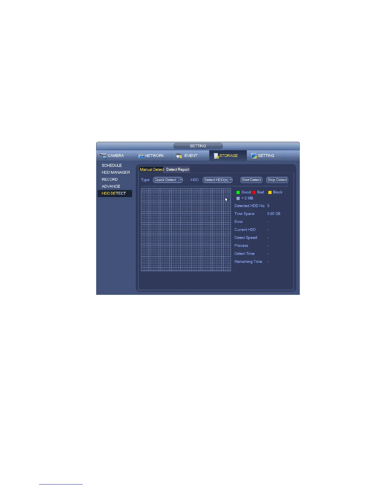 From main menu->Setting->Storage->HDD Detect->Manual Detect, the interface is shown as below. See