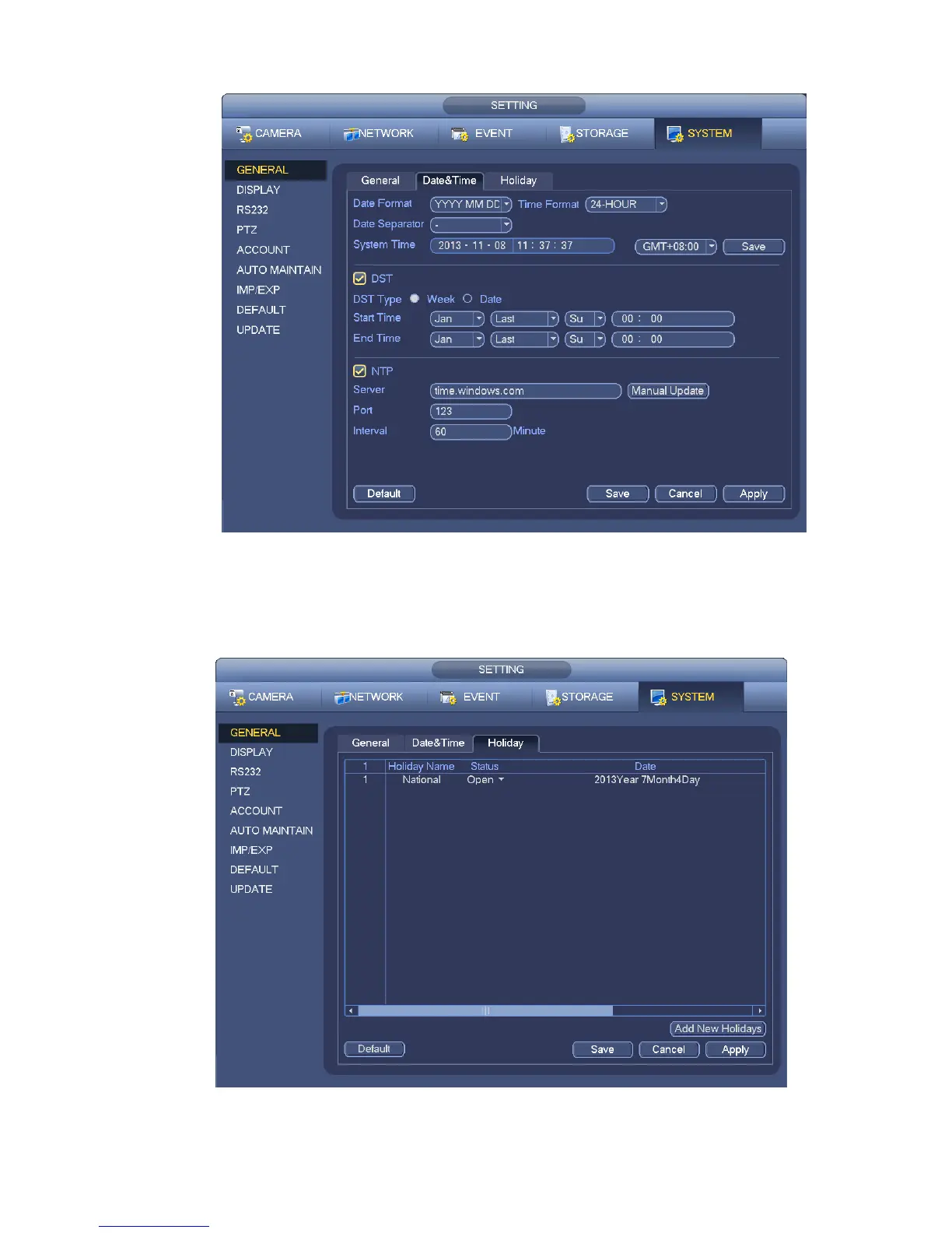 holiday information. See Figure 4-139. Here you can set holiday name, repeat mode and start/end time.
