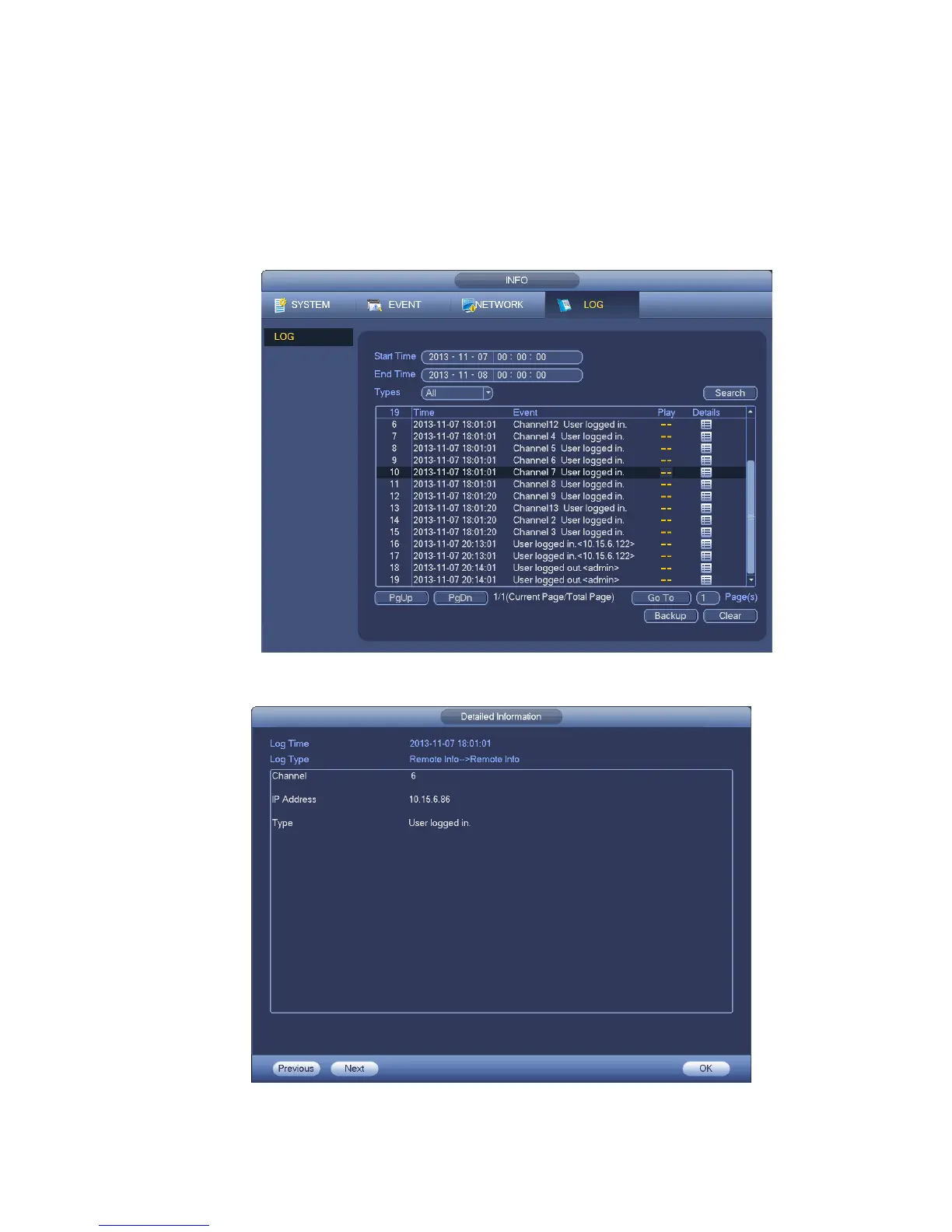 From Main menu->Info->Log, you can go to the following interface. See Figure 4-146.