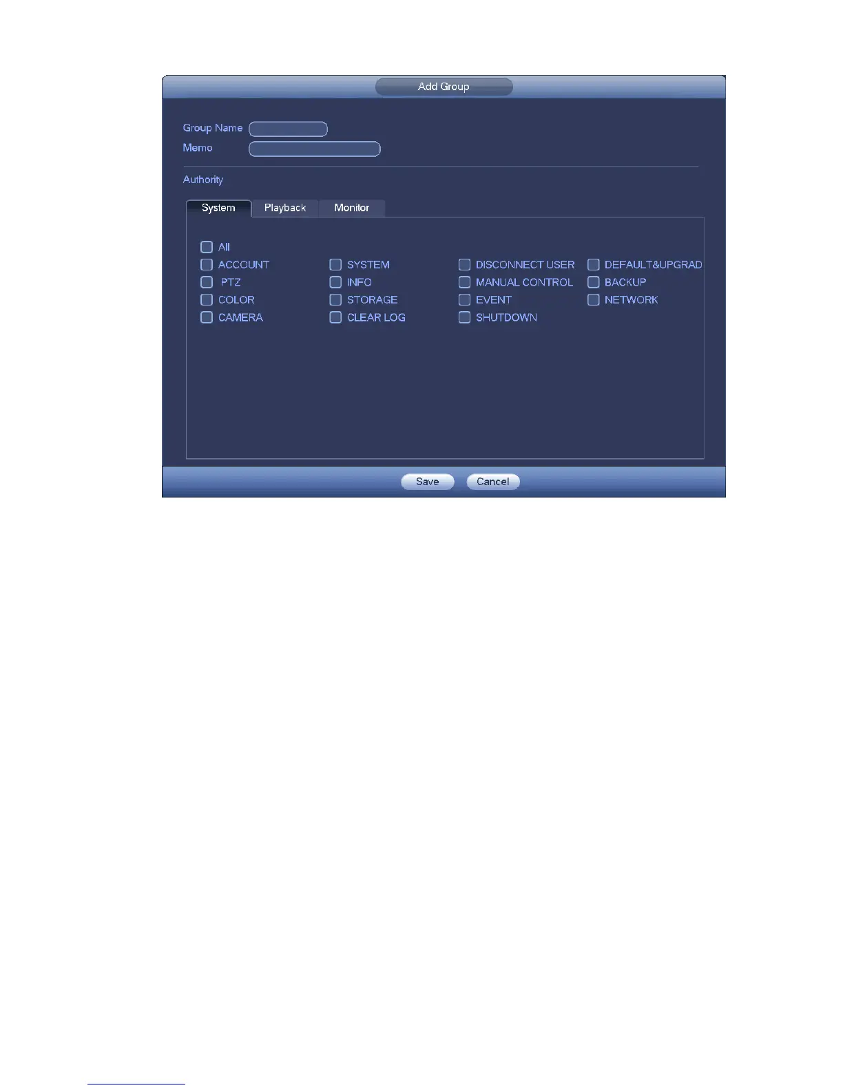 Please input the user name, password, select the group it belongs to from the dropdown list.