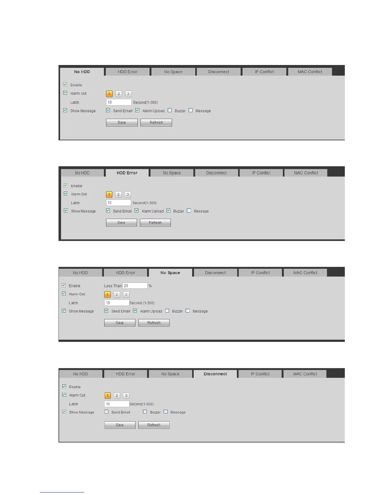 It includes six types: No disk, disk error, disks no space, disconnect, IP conflict, MAC conflict. See Figure