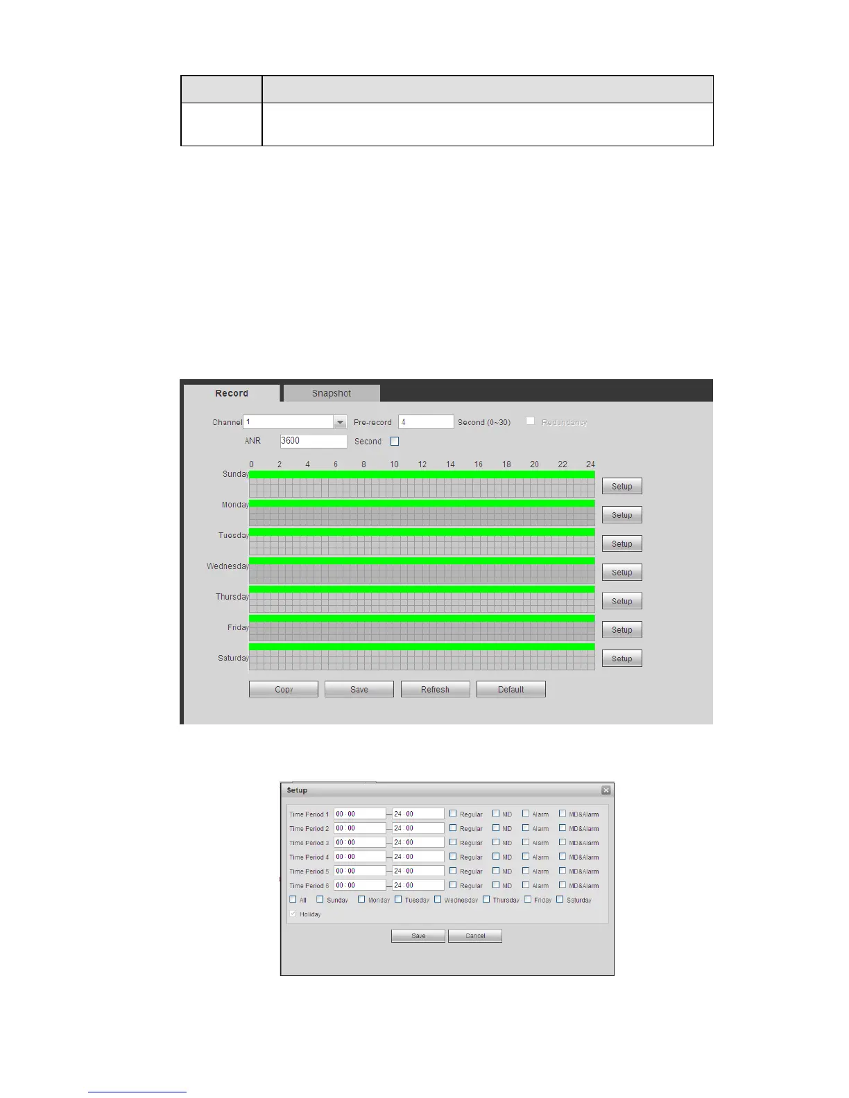 There are four record modes: general (auto), motion detect, alarm and MD&alarm. There are six periods
