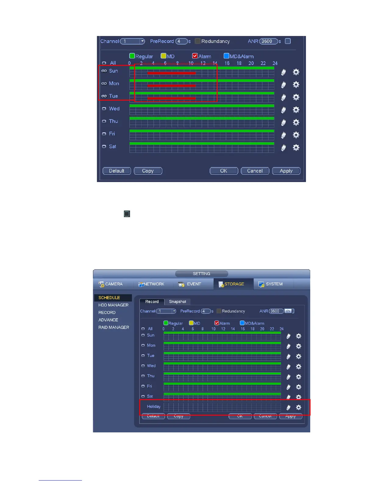 for motion detection and red color stands for alarm recording. The white means the MD and alarm