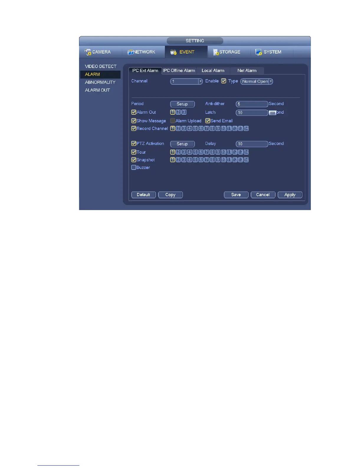 c) From Main menu->Setting->Event->Alarm, you can go to Figure 4-65 to set alarm parameter