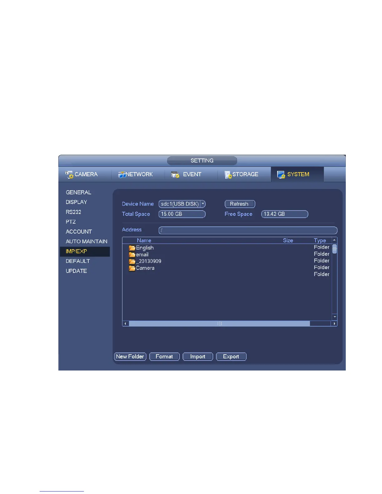 From Main menu->Setting->System->Import/Export, you can see the configuration file backup interface is