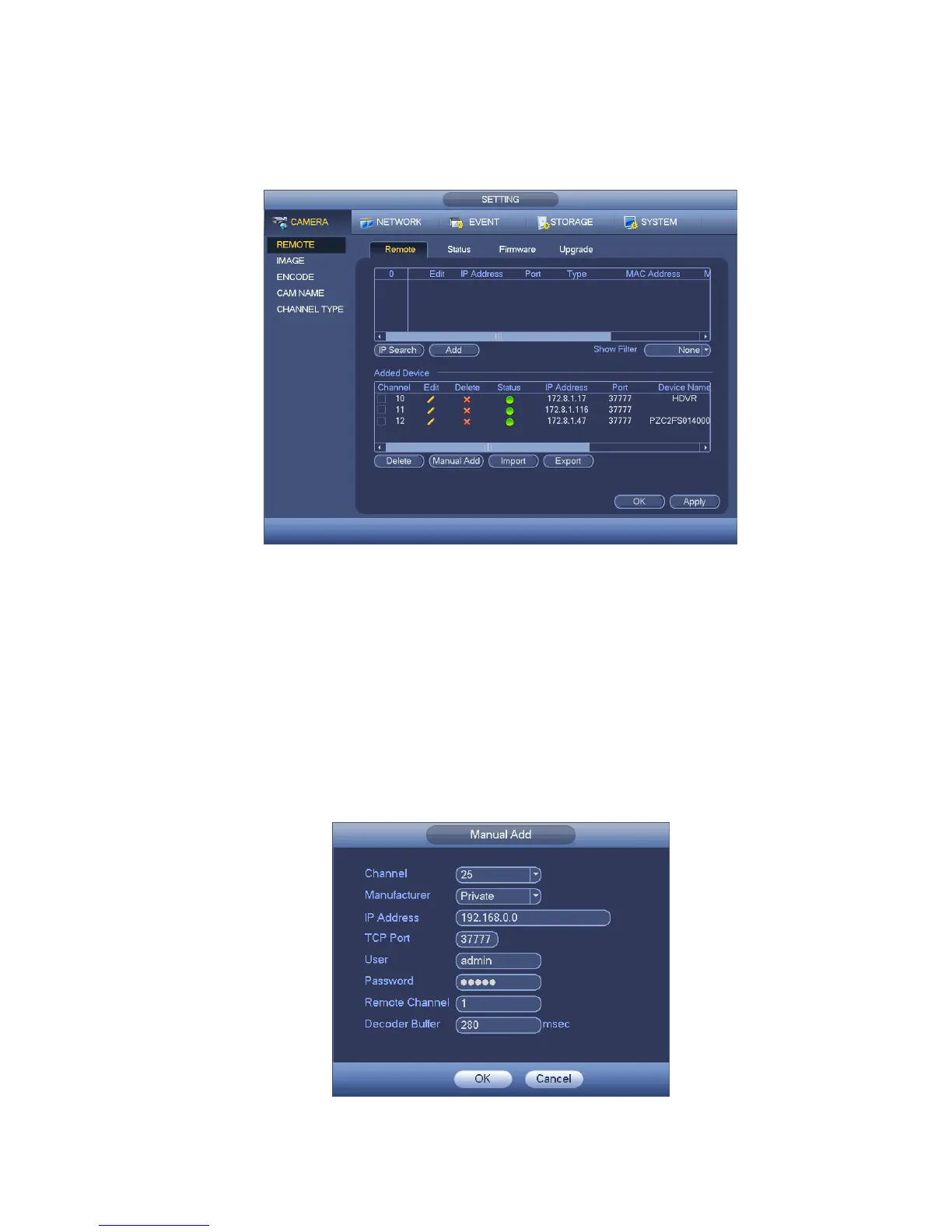 Manual add: Click it to add the IPC manually. The port number is 37777. The default user name is