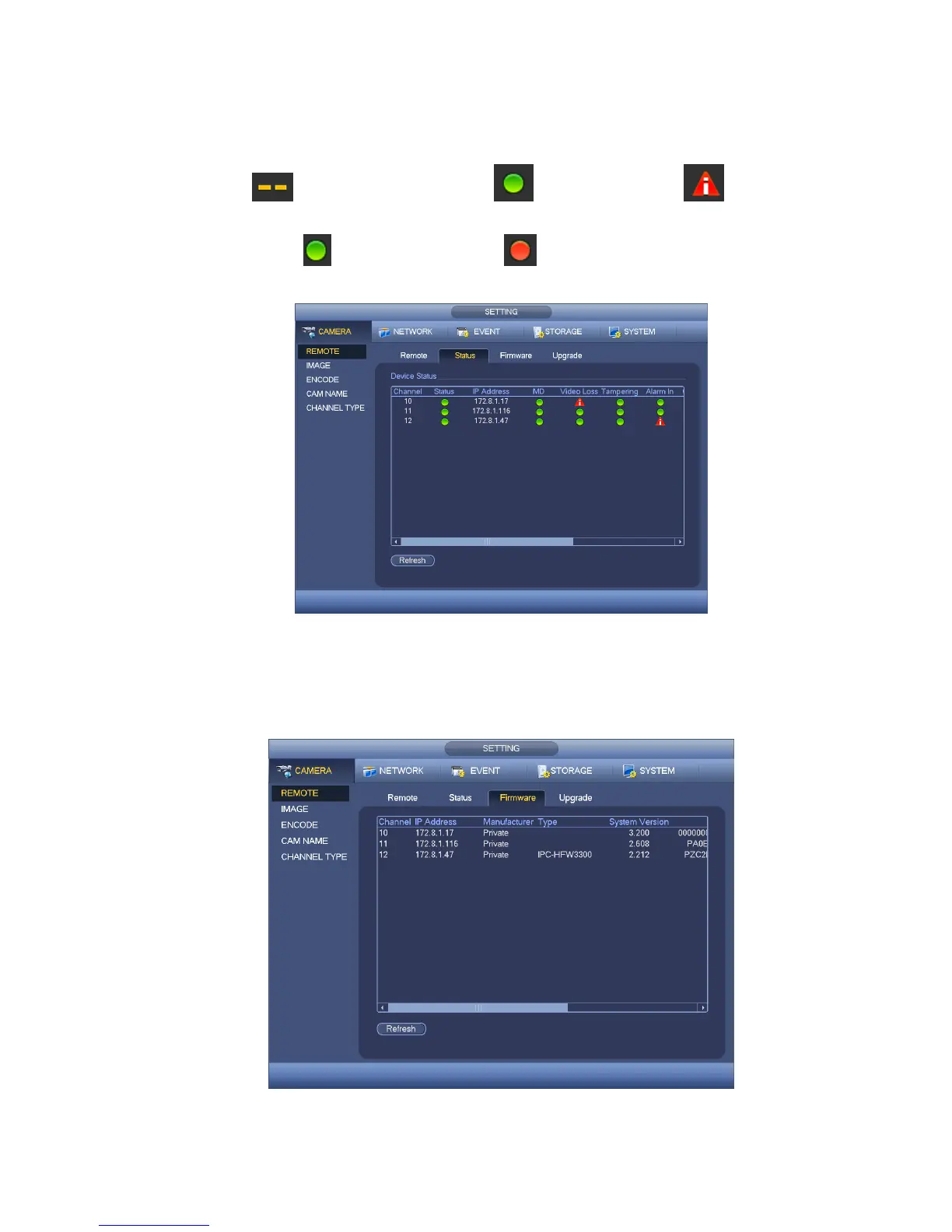 IPC status: : Front-end does not support. : Front-end supports. : There is alarm