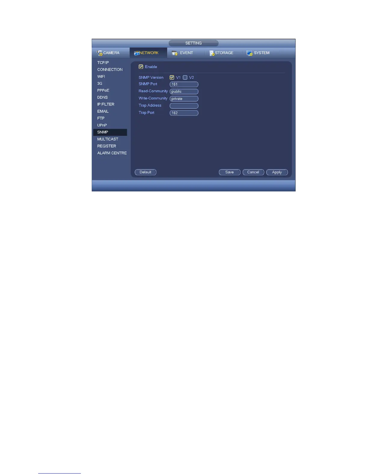 In Figure 4-76, check the box to enable the SNMP function. Input the IP address of the PC than is