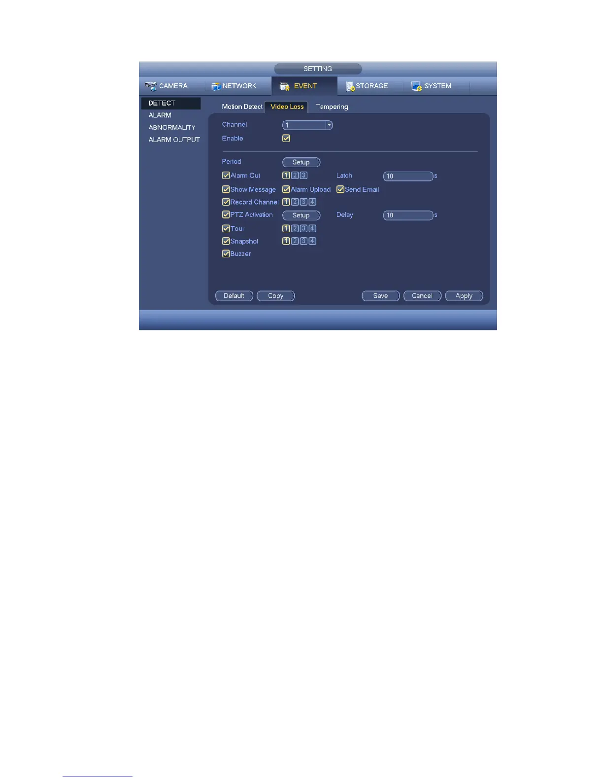 not copy a channel setup in video loss mode to tampering mode.