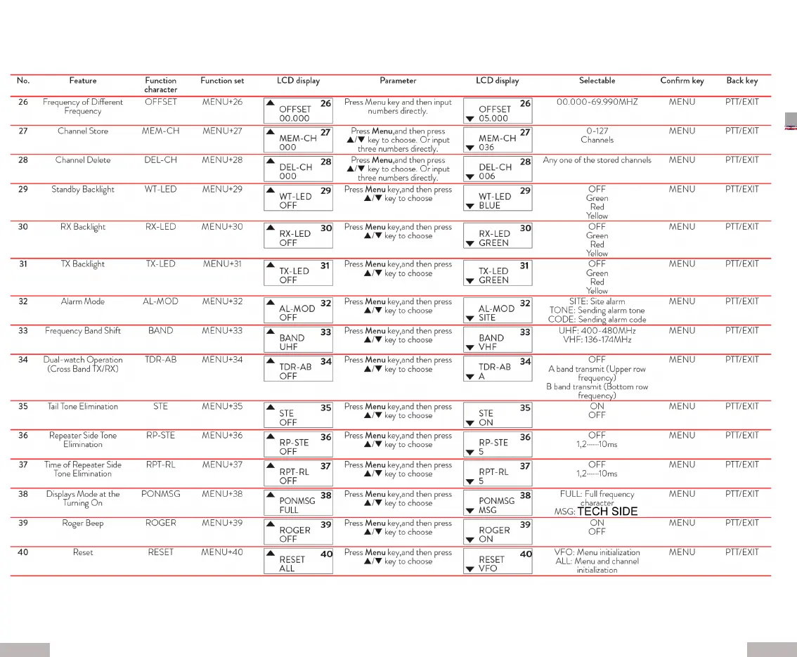 TechSide TS-T9+ - Menu Operations - Part 3; Channel Deletion and Backlight Control; Alarm Modes and Frequency Band Shifting; Dual Watch and Tone Elimination Settings