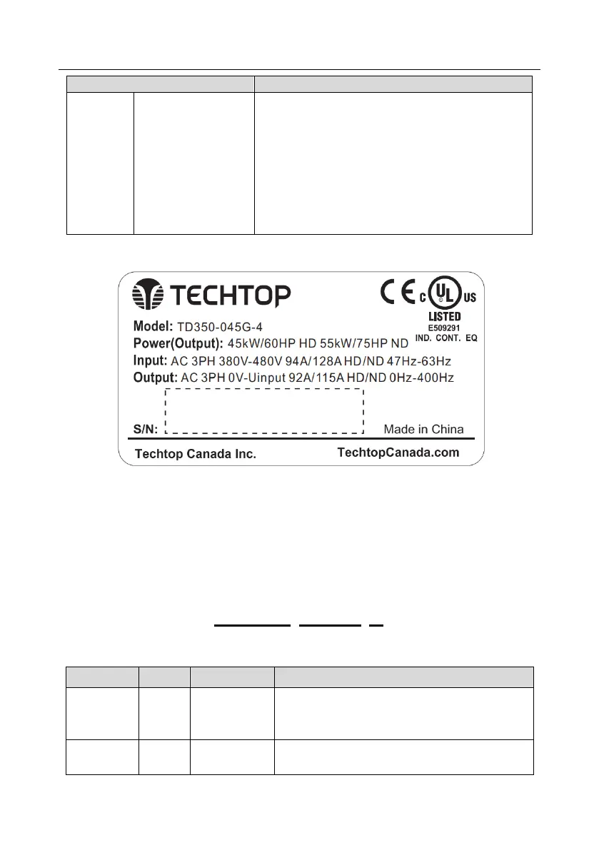 Note: This is an example of the nameplate of standard TD350 products. The CE/TUV/IP20 marking