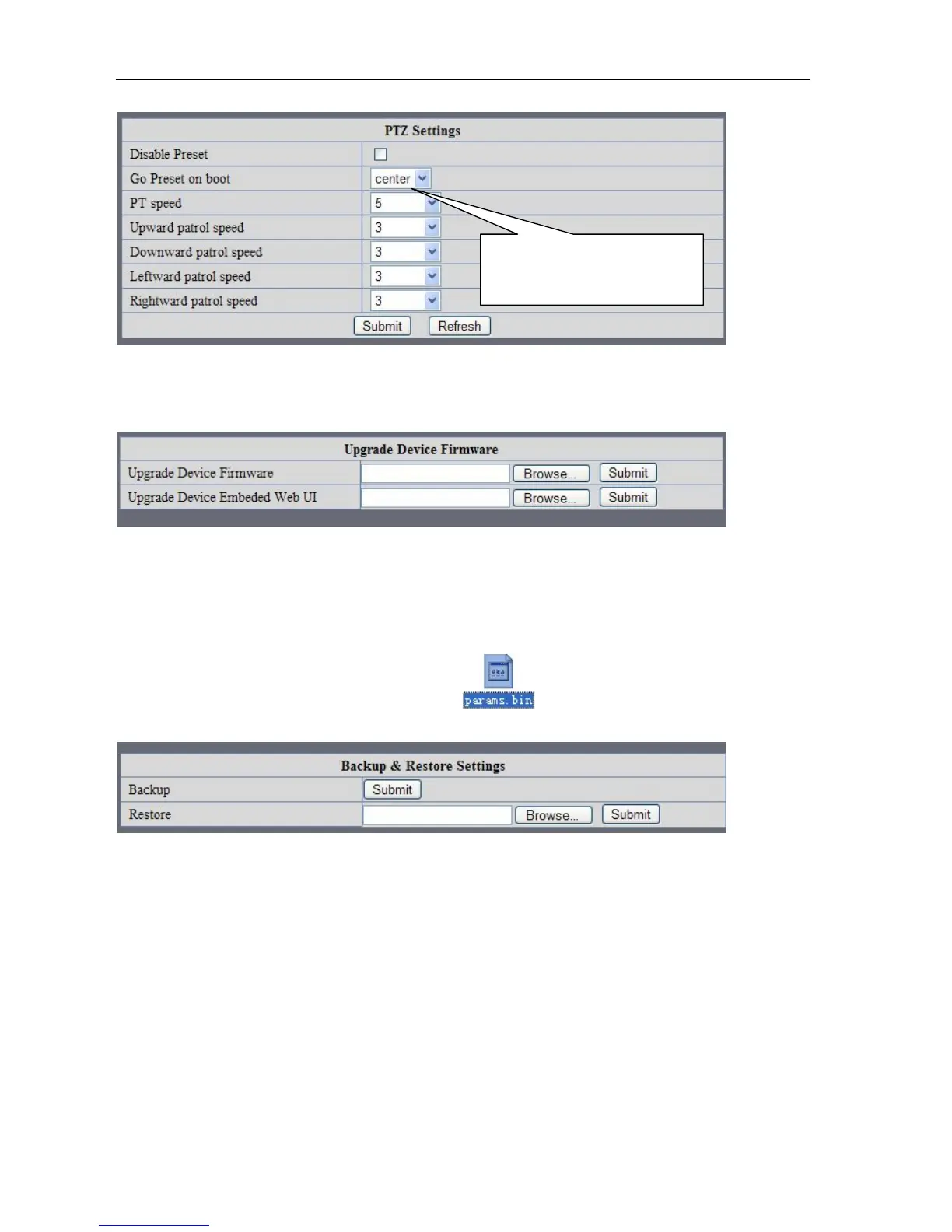Click " Set" in the ' Backup" will lead to a BIN file ,and choose this file to restore setting!