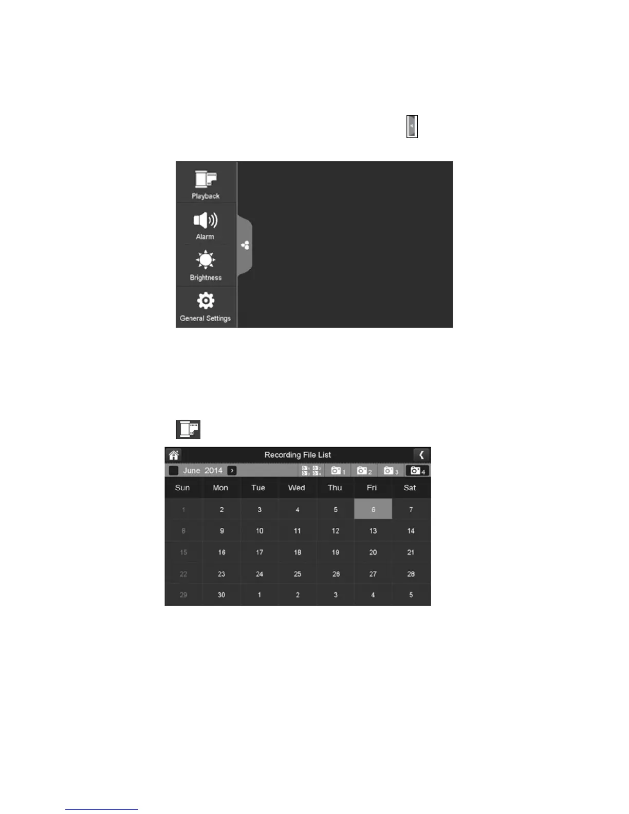 This pop up menu tab will display settings for playback recorded files, set alarms, change