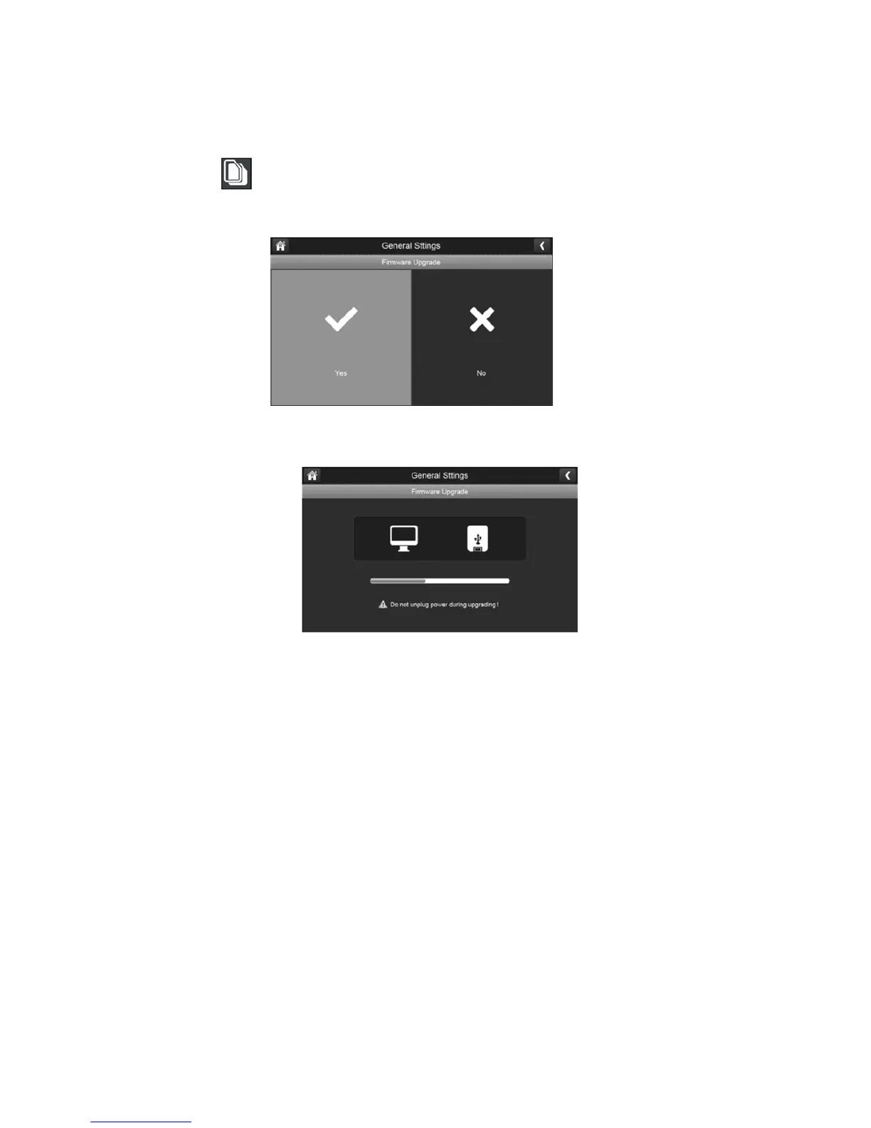 To upgrade the firmware through the SD card, select yes on the confirmation screen.