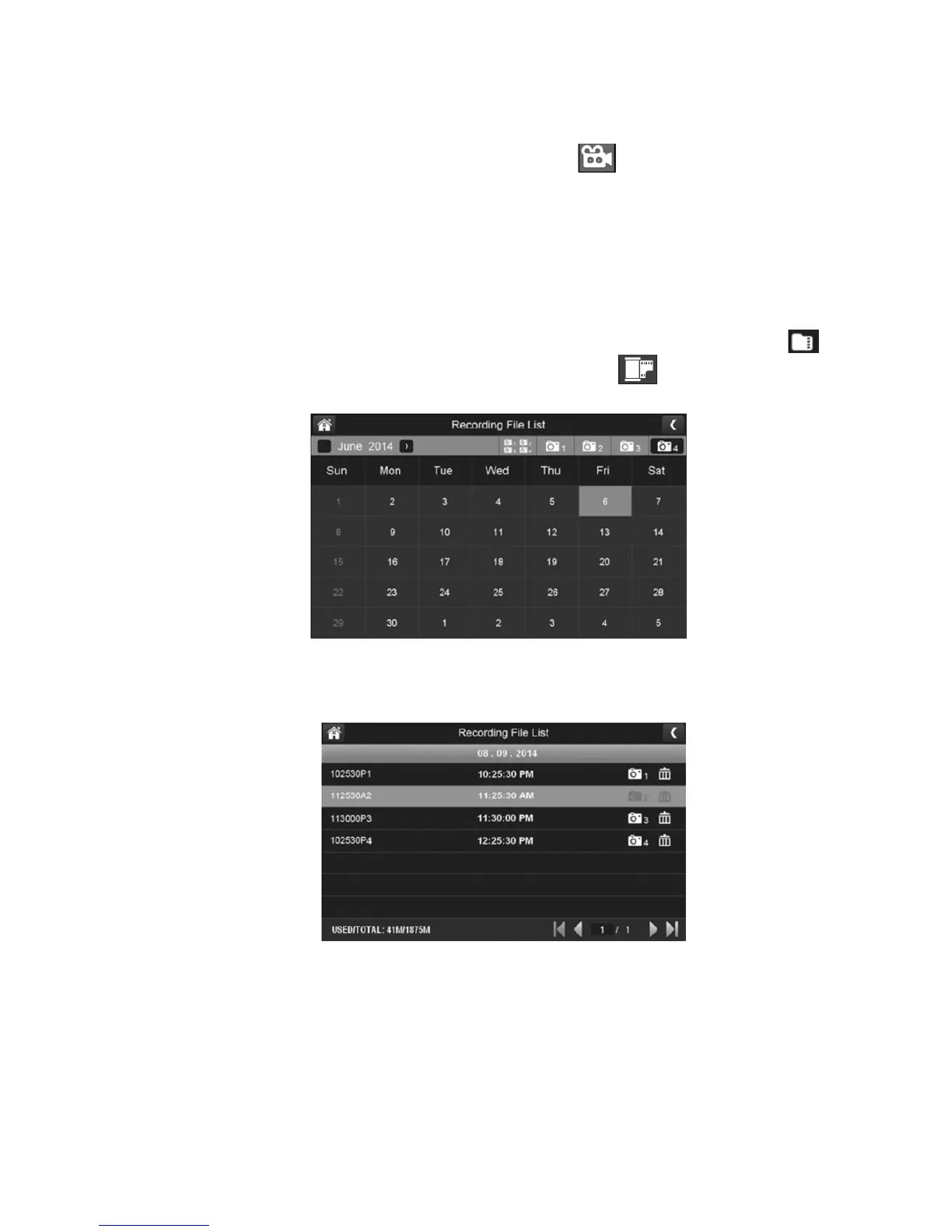 camera to only view that camera’s recordings. The recording file list screen displays