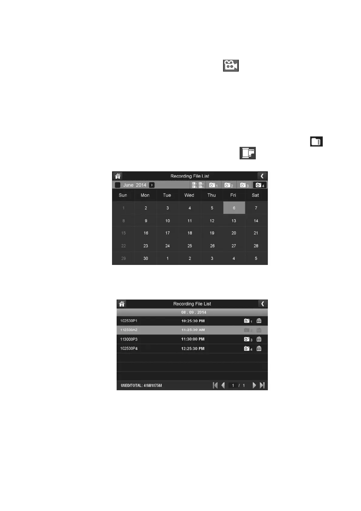 camera to only view that camera’s recordings. The recording file list screen displays