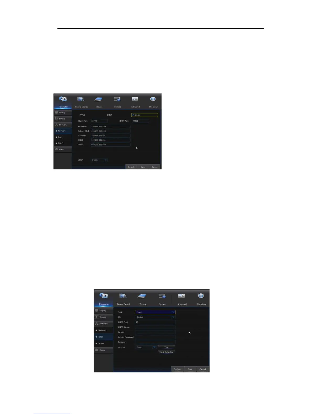 Go to“Main Menu”→“Parameter”→“Network”→“Email” to enter into the menu interface.