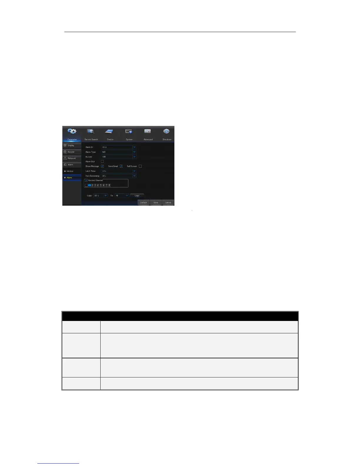 Go to“Main Menu”→“Alarm”→“Alarm”to enter into the interface shown as Picture