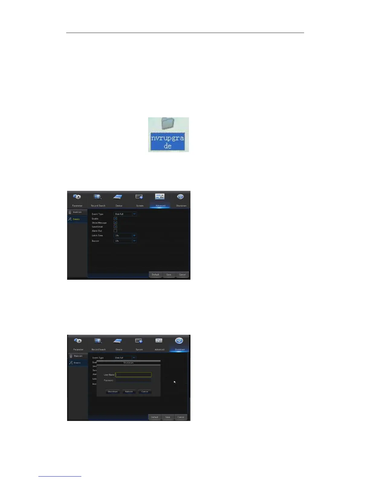 Save Settings: Save the set parameters of user’s NVR to the removable storage