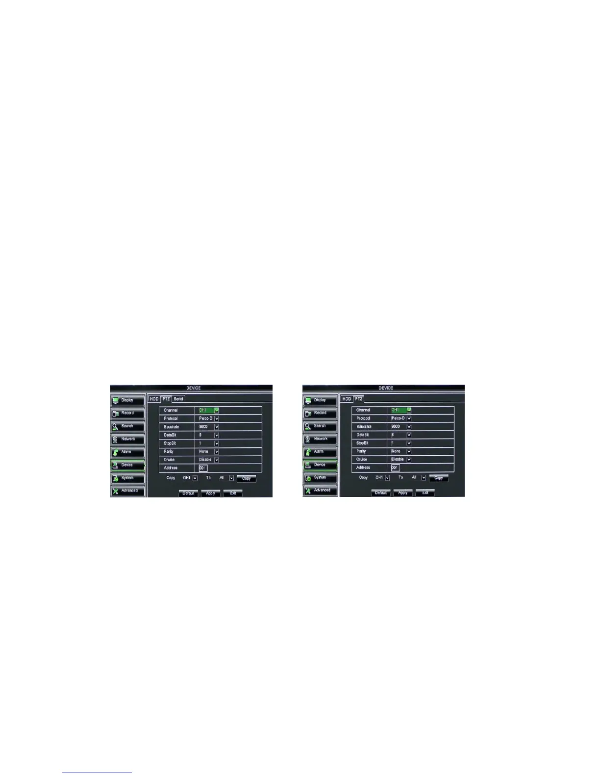 You could select the channel you desire to control and set PTZ protocol (Pelco-D or